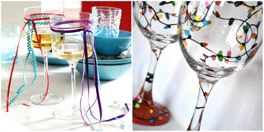 Зробити звичайні скляні келихи по-новорічному яскравими досить просто: достатньо прикрасити їх барвистими атласними стрічками. Всього кілька хвилин — і звичні келихи зміняться до невпізнання. Ще один цікавий варіант — зробити на них малюнки емалевою фарбою. Таких келихів, як у вас, точно ні в кого не буде.
