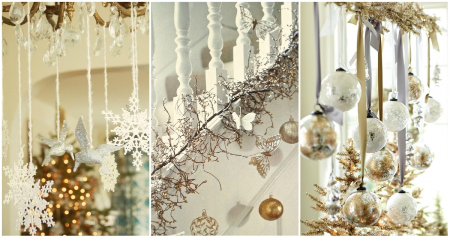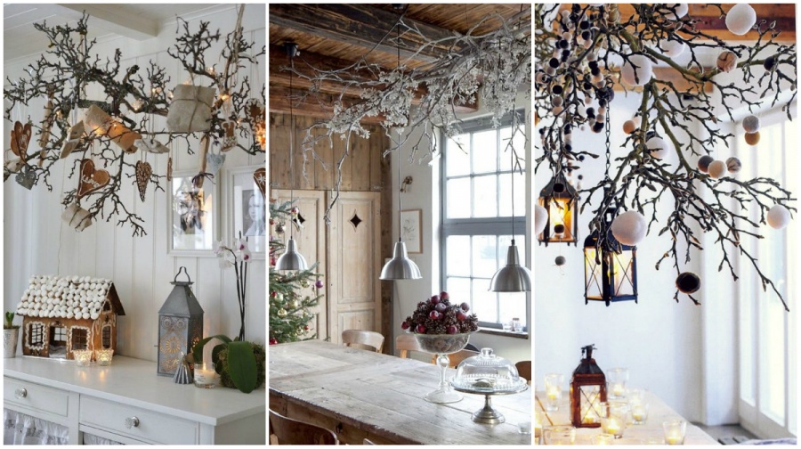 Витончене новорічну прикрасу можна зробити зі звичайної гілки. Пофарбуйте її срібною фарбою з балончика і прикріпіть до люстри або карниза. Тепер повісьте на гілку ялинкові іграшки — казкова атмосфера гарантована.