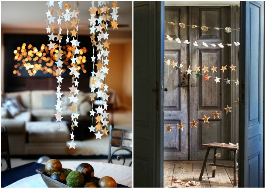 Світяться гірлянди гарантовано створять новорічний настрій. Повісьте їх буквально скрізь: на перилах сходів, стелі та стінах, уздовж шаф і дверних прорізів і, звичайно ж, на ялинці. Зробити гірлянди можна самостійно — наприклад з гофрованого паперу або фольги.