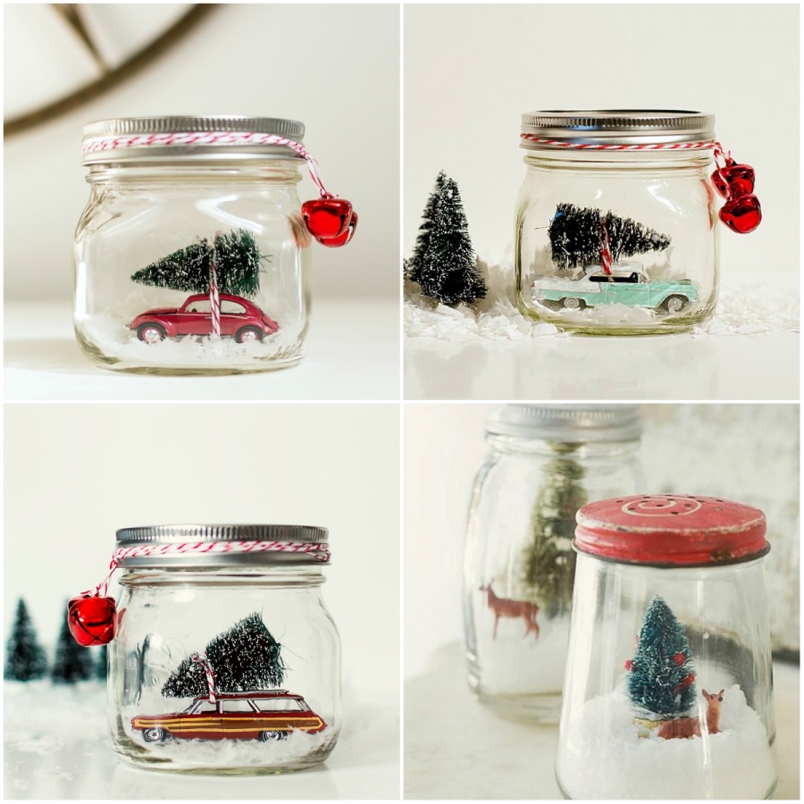 Не забудьте про дітей — зробіть для них своїми руками красиву новорічну прикрасу. Для цього просто покладіть в баночку дитячу іграшку і ялинку, а в якості снігу використовувати рис або вату.