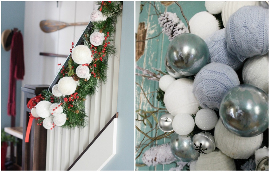 Зробити ялинкові іграшки можна з чого завгодно — навіть з старого шарфа чи светри. Це не займе багато часу: візьміть ялинкова кулька і щільно обтягніть його вовняною тканиною. Тепер закріпіть тканину у підстави кульки за допомогою стрічки — і можна вішати кулька на ялинку, вікна або перила.