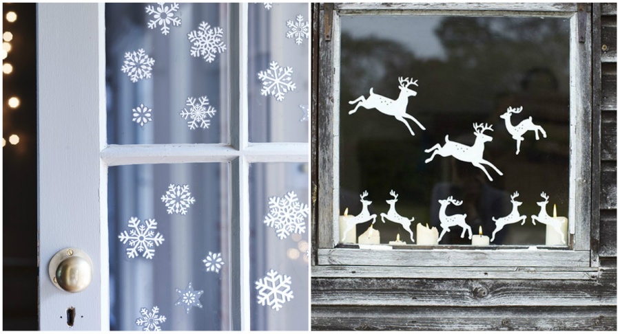 Не забудьте про декор вікон і намалюйте красиві морозні візерунки. Для цього виріжте трафарети із щільного паперу і приготуйте фарбу: змішайте зубну пасту з водою до густого стану. Тепер залишилося докласти трафарети до вікон і промокнути їх губкою.
