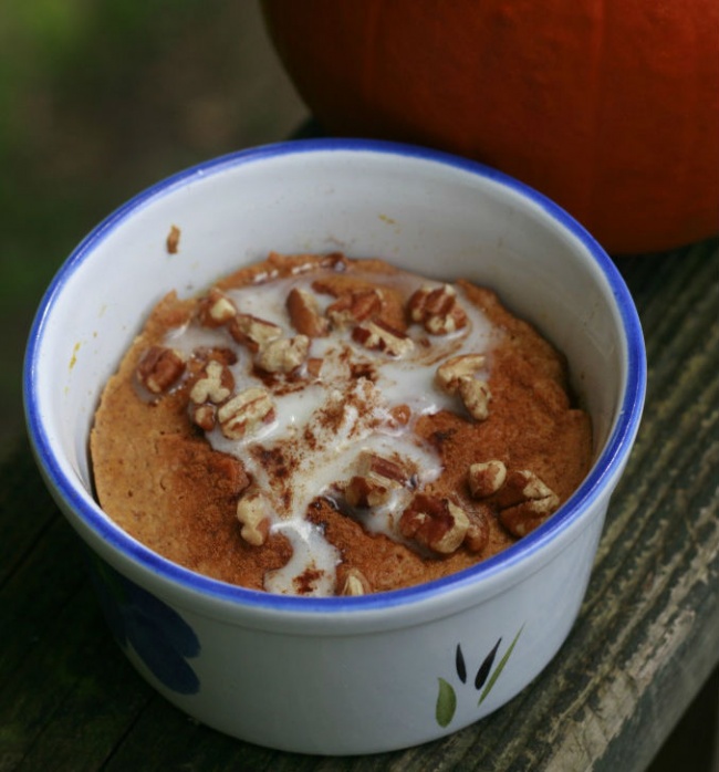 Змішайте інгредієнти для тіста, викладіть в кухоль. В окремій мисці перемішайте гарбуз, яйце, корицю, мускатний горіх, мед (цукор, сироп) до отримання однорідної маси. Викладіть її в кухоль поверх тіста так, щоб залишилося місце до краю. Пальцями злегка притисніть і розрівняйте поверхню. Поставте в мікрохвильовку на 2 хвилини. Перевірити зубочисткою, якщо пиріг всередині вологий, поверніть його назад на 20-30 секунд.