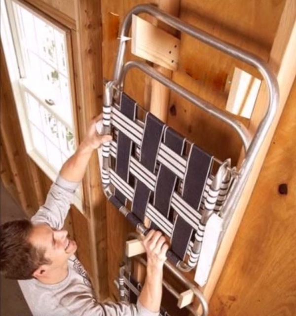 Розкладне ліжко або стілець можна зберігати, якщо повісити ось так на стіну.