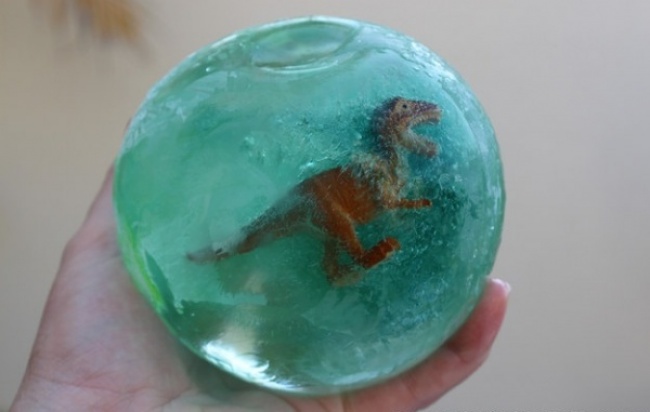 Візьміть динозавра і засуньте його в повітряну кулю. Налийте в кулю з динозавром воду (можна додати ще й барвник) і зав'яжіть його. Поставте кулю в морозилку на кілька годин. Коли вода охолоне, розірвіть кульку. Надіньте захисні окуляри дитині і собі і починайте «розкопки», щоб дістатися до динозавра.