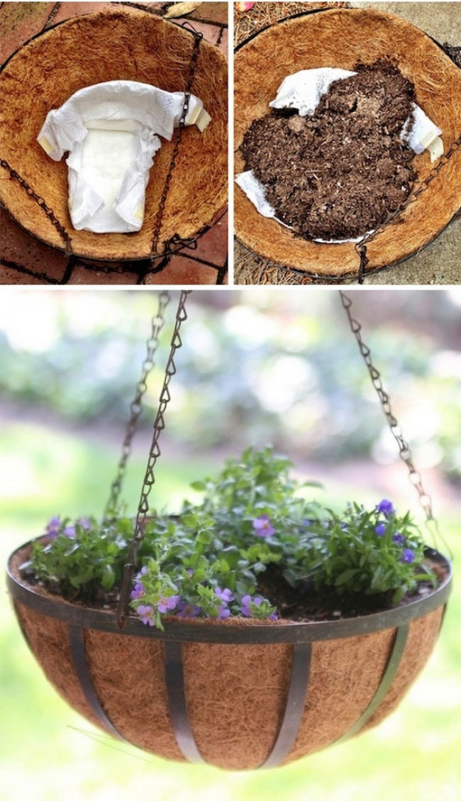 Земля в садових кашпо дуже швидко пересихає. Щоб зберегти вологу, можна використовувати підгузники. Вони спочатку вбере надлишок води, а потім потихеньку віддавати її рослинам.