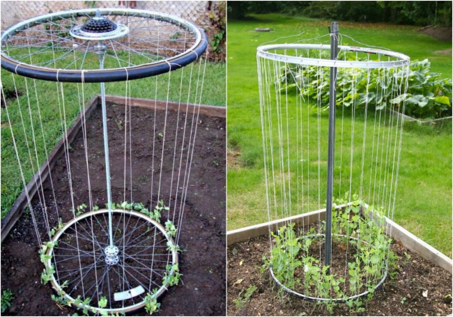 Зі старих велосипедних коліс або ободів можна спорудити чудову вертикальну грядку для огірків або зеленого горошку.