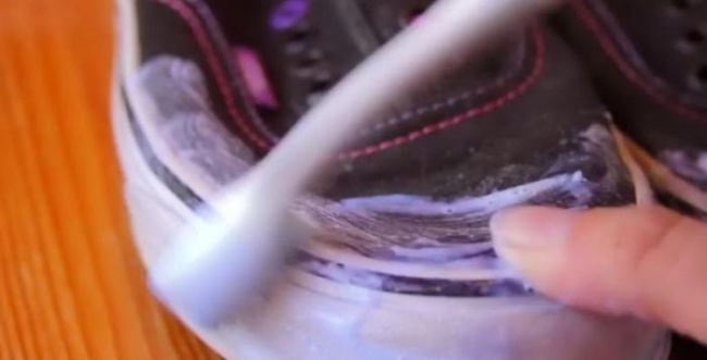 - Змішайте миючий засіб і соду в мисці. Візьміть використану зубну щітку і проведіть генеральне чищення білої окантовки кед.