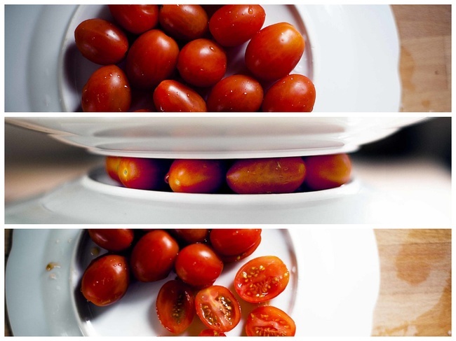 Для того щоб швидко порізати помідори черрі, покладіть їх між двома плоскими тарілками і проведіть гострим ножем.