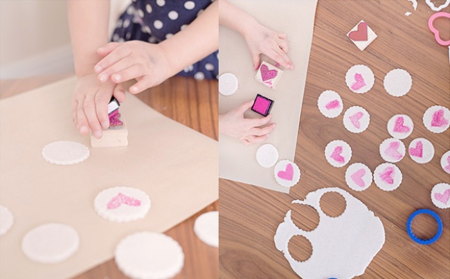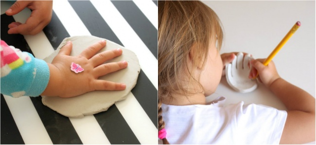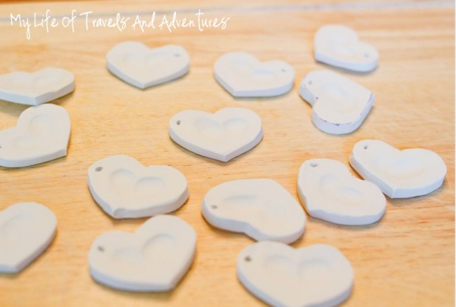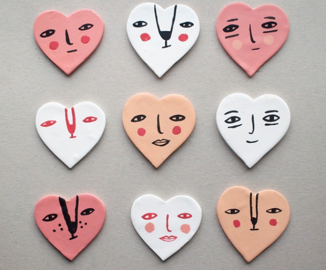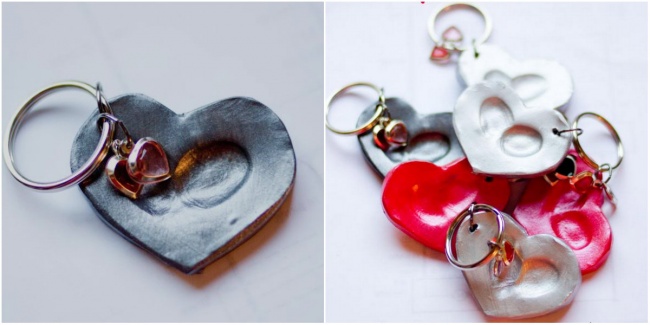 Вирізаємо сердечка з глини, ставимо відбитки пальчиків, робимо отвір для брелочного кільця і відправляємо запікатися в духовку. Потім розфарбовуємо, як хочемо. Інструкція тут.