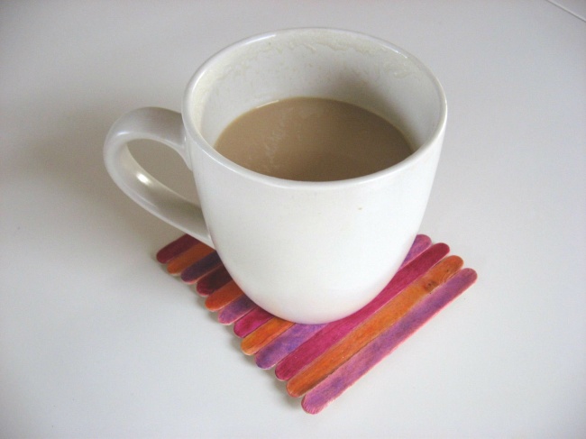 Ваша дитина легко зможе зробити яскраву підставку для улюбленої чашки з розфарбованих паличок для морозива. Докладніше тут.