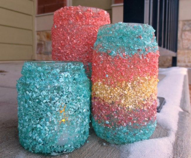 А такі свічники робляться з допомогою крупної солі, харчових барвників і клею. Більш докладний порядок дій дивіться тут.