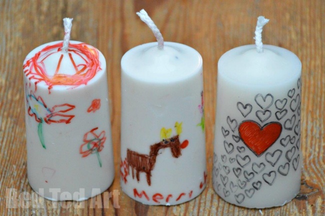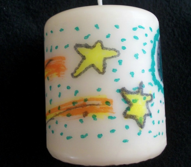 Попросіть дитину намалювати малюнок на клаптику цигаркового обгорткового паперу, а потім закріпіть її на свічці за допомогою фена. Як це робиться, дивіться тут. А можна просто намалювати на свічці що-небудь звичайним маркером (але такий малюнок буде триматися менш стійко).