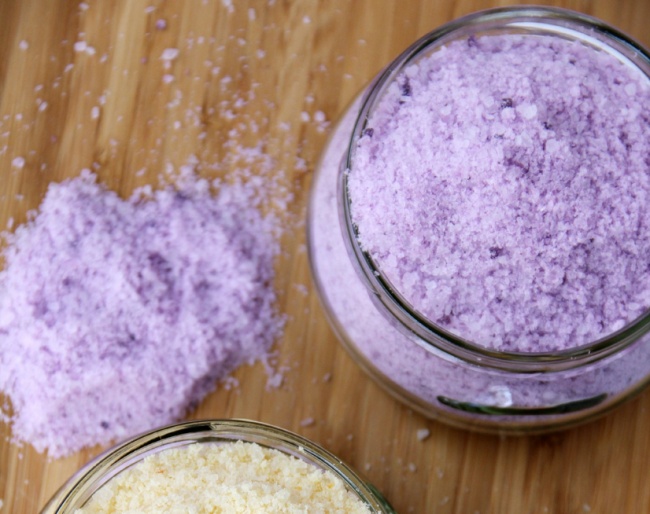 Змішуємо морську сіль, ефірні масла і трохи харчового барвника для апетитного кольору і виходить прекрасна сіль для ванн. Наприклад, так.