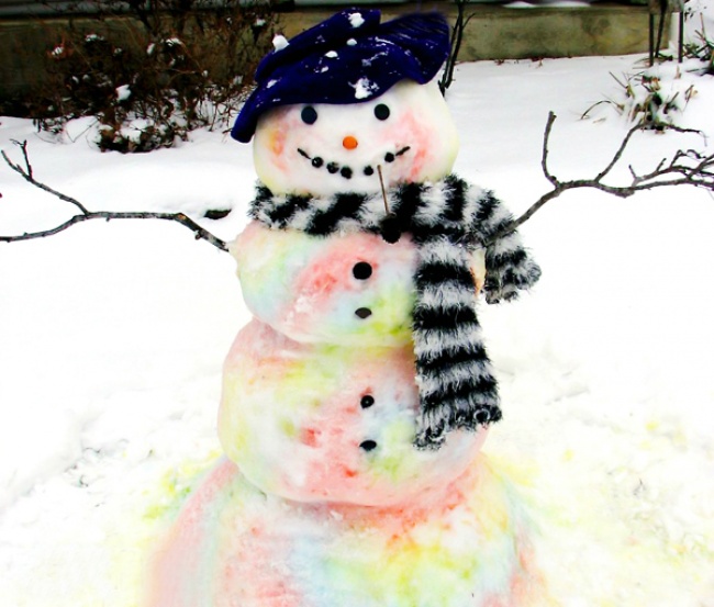 - Розведіть харчові фарби у воді, заповніть розпилювач і розмалюйте сніговика!