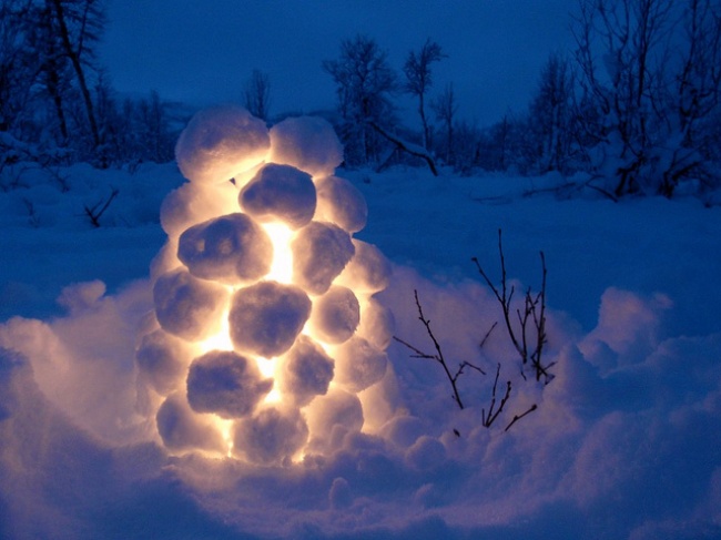 - Зробіть вуличний світильник зі снігу. Наліпити снігових куль, викладіть їх гіркою, а всередину помістіть увімкнений ліхтарик. Краса!