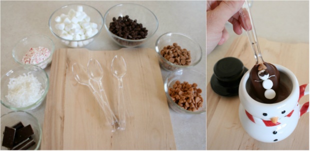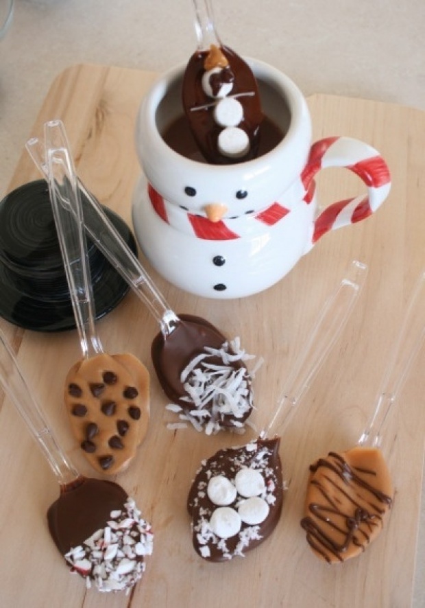 - Розтоплюємо шоколад, опускаємо в нього пластикову ложку, а коли шоколад трохи охолоне, додаємо поверх нього зефірінки, горіхи, родзинки, кокосову стружку — все, що захочете. Шоколадні ложки до чаю після зимової прогулянки готові.