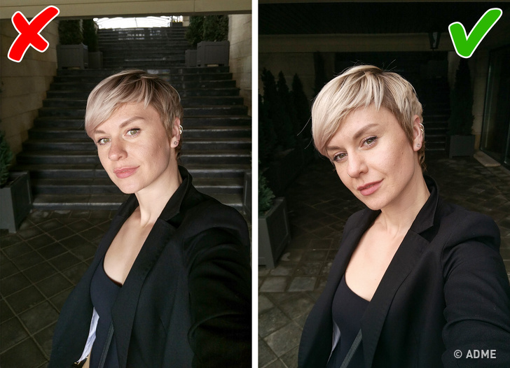 Трохи покрутіть камеру, спробуйте зловити особою світло. Не забувайте, що освітлення повинно падати на вас, а не світити з-за спини, в іншому випадку ви отримаєте тільки силует.
