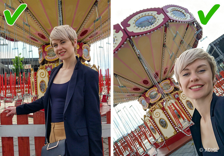 Давайте розглянемо на нашому прикладі. У нас є симпатична карусель і не менш симпатична модель, як їх поєднати? Можна просто встати поруч з атракціоном і сфотографуватися, а можна зробити селфи і змінити кут нахилу — вийде пустотливий і кумедний кадр. Так ми побачимо і круглу дах каруселі і гойдалки, і додамо знімку жвавості. Не бійтеся і експериментуйте з кутом нахилу, коли це доречно.