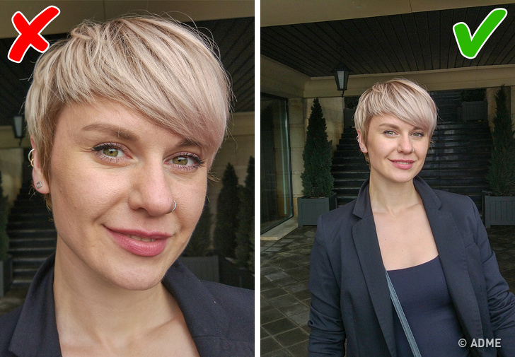 Справа в тому, що при близькій зйомці змінюється геометрія кадру, як результат, спотворюється зовнішність. Особа стає як у хом'яка, а це навряд чи буде вам на руку. Трохи відштовхнете об'єктив — і ви побачите, що знімок вийде набагато краще.