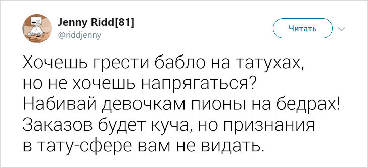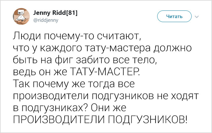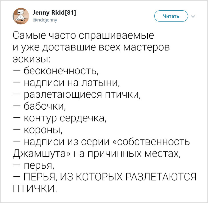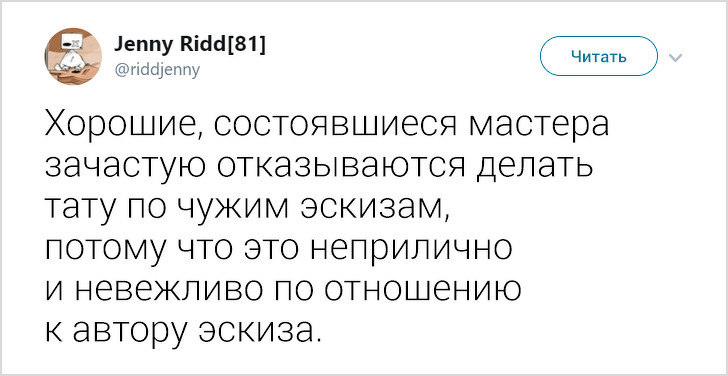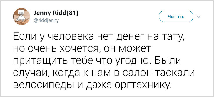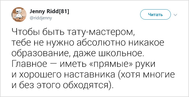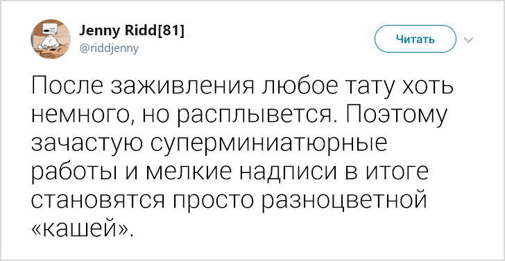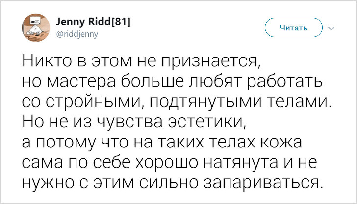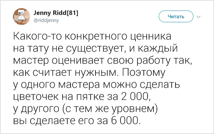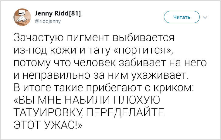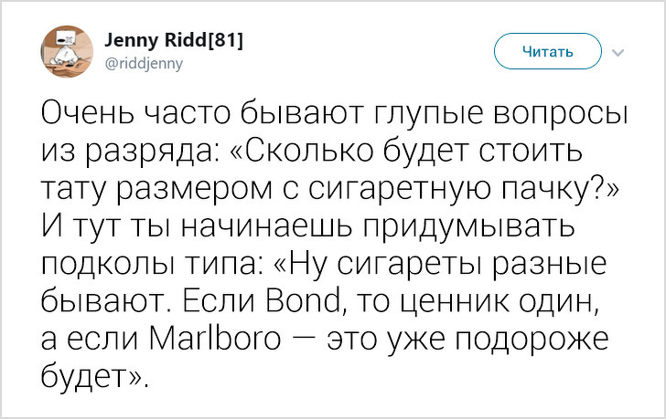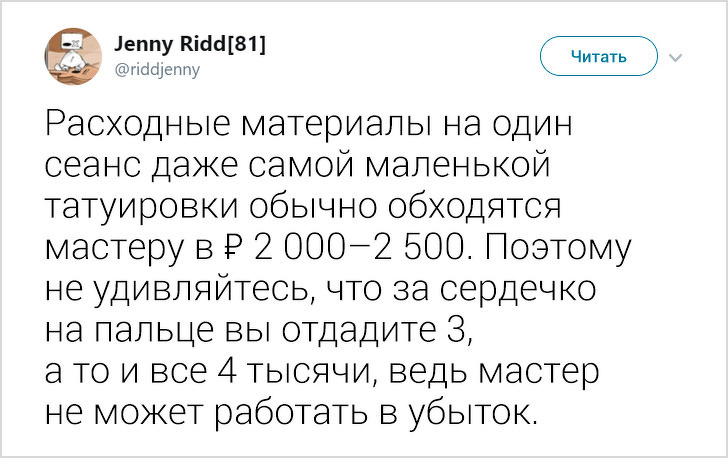 Більшість з нас любить татуювання або хоча б захоплюється ними з боку. Але, як виявилося, ми зовсім нічого не знаємо про роботу тату-майстрів. Художниця з Челябінська вирішила провести лікнеп у своєму твіттері і поділилася секретами і цікавими спостереженнями, які зробила за час роботи татуювальницею в двох салонах.