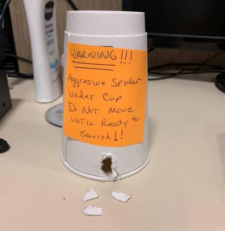 «Увага! Під стаканчиком агресивний павук. Не зрушувати до того моменту, поки не будеш готова його розчавити».