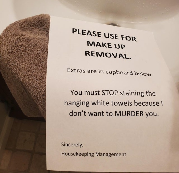 «Будь ласка, використовуй це для зняття макіяжу. Додаткові рушники в ящику знизу. Ти повинна ПРИПИНИТИ залишати плями на висячих білих рушниках, тому що мені дуже не хочеться тебе вбивати. З повагою, керуючий житловим господарством».