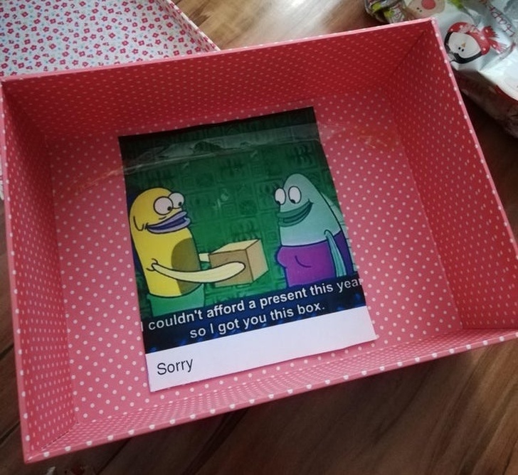 «У цьому році мені не вистачило грошей на подарунок, тому вручаю тобі цю коробку. Прости».