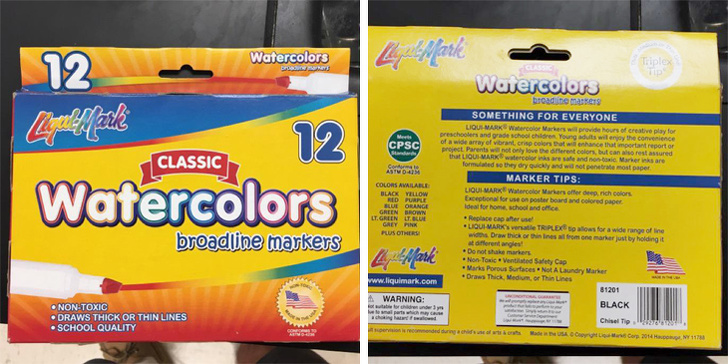 Лицьова сторона упаковки явно говорить про те, що всередині кольорові акварельні маркери. І тільки на задній стороні дрібним шрифтом зазначено, що колір маркерів — чорний