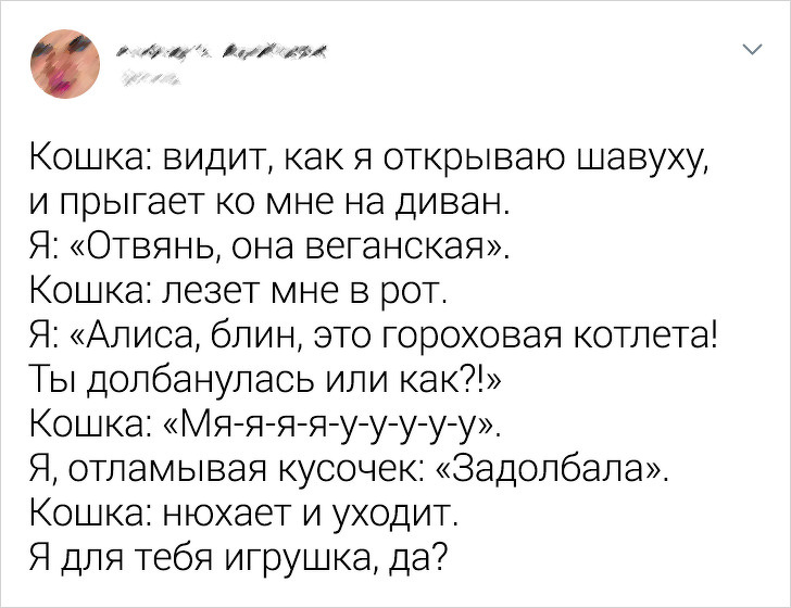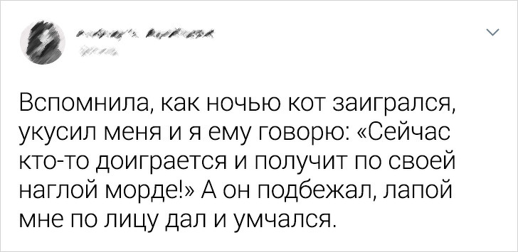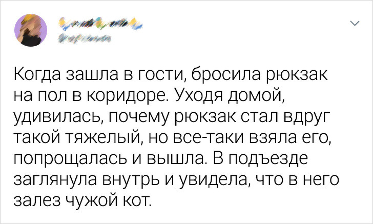 «Здавалося, мій кіт згасає. Він не їв, не пив, ховався і спав. Так що сьогодні я відвезла його до ветеринара, і той сказав: „Він здоровий. У нього депресія з-за того, що він, мабуть, програв у бійці“»