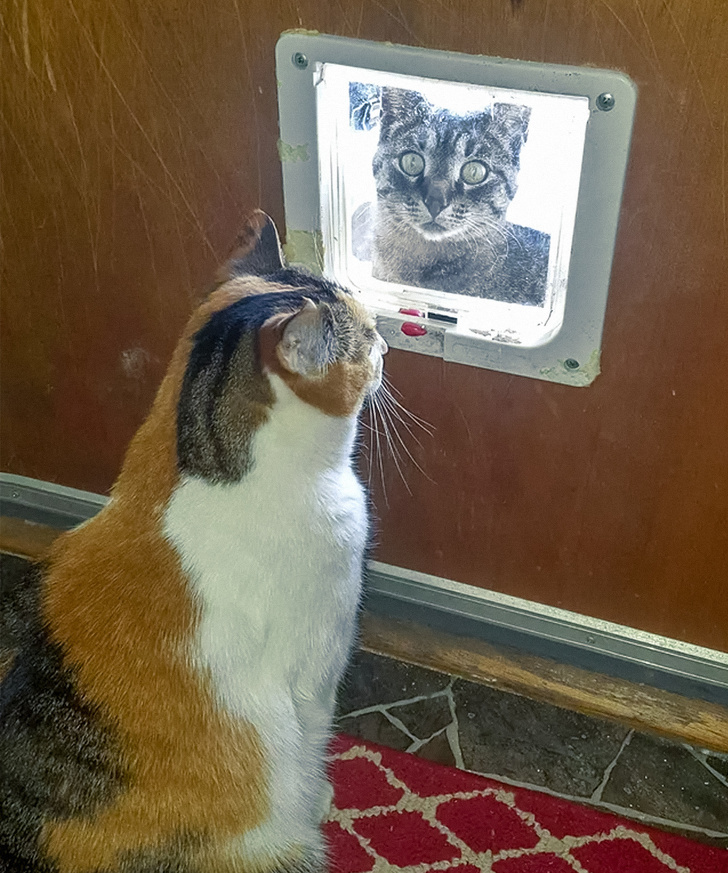 «Мої коти в безвихідному становищі. Два впертих осла хочуть пройти через отвір у двері. Цікаво, хто здасться першим?»