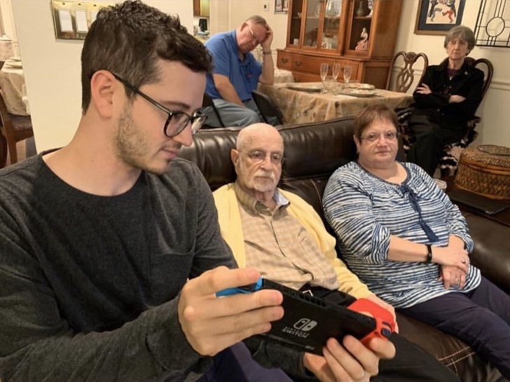 5. Хлопець показує родині свою колекцію покемонів. Все виглядають вкрай розчарованим, особливо чоловік у синьому