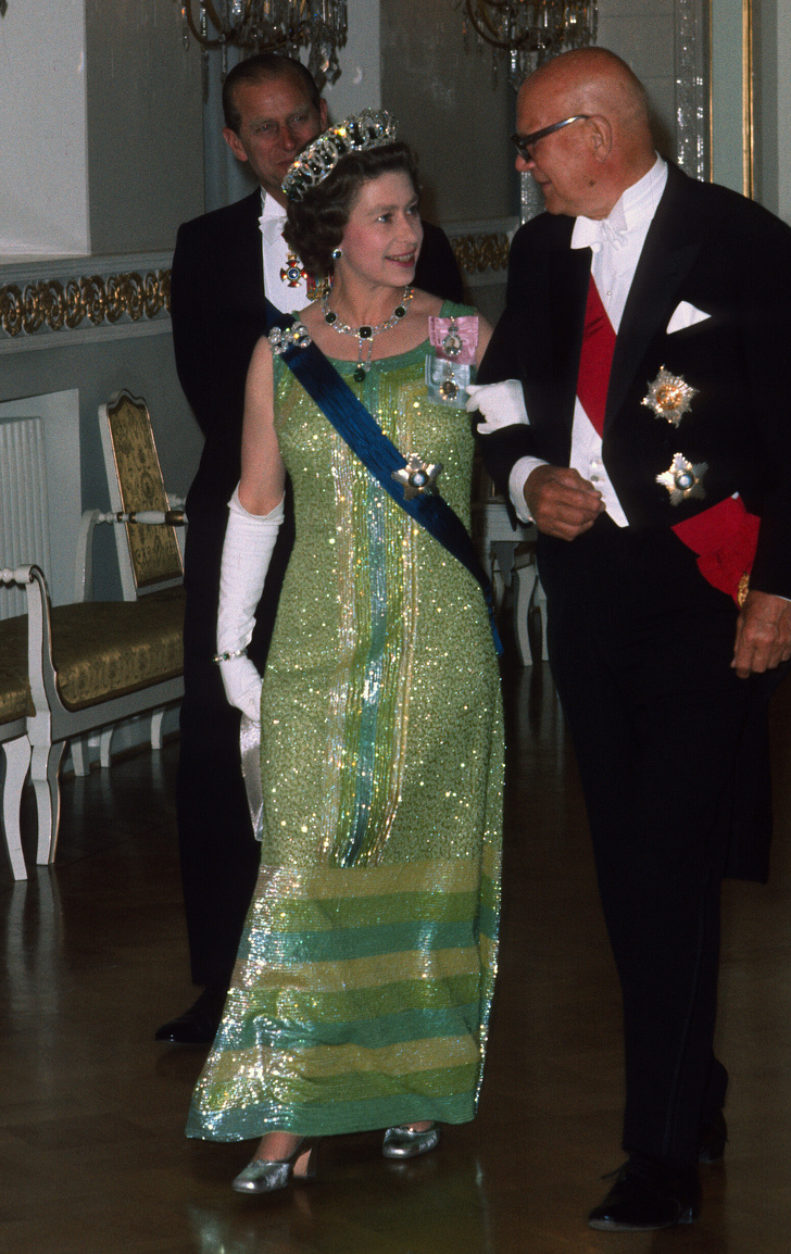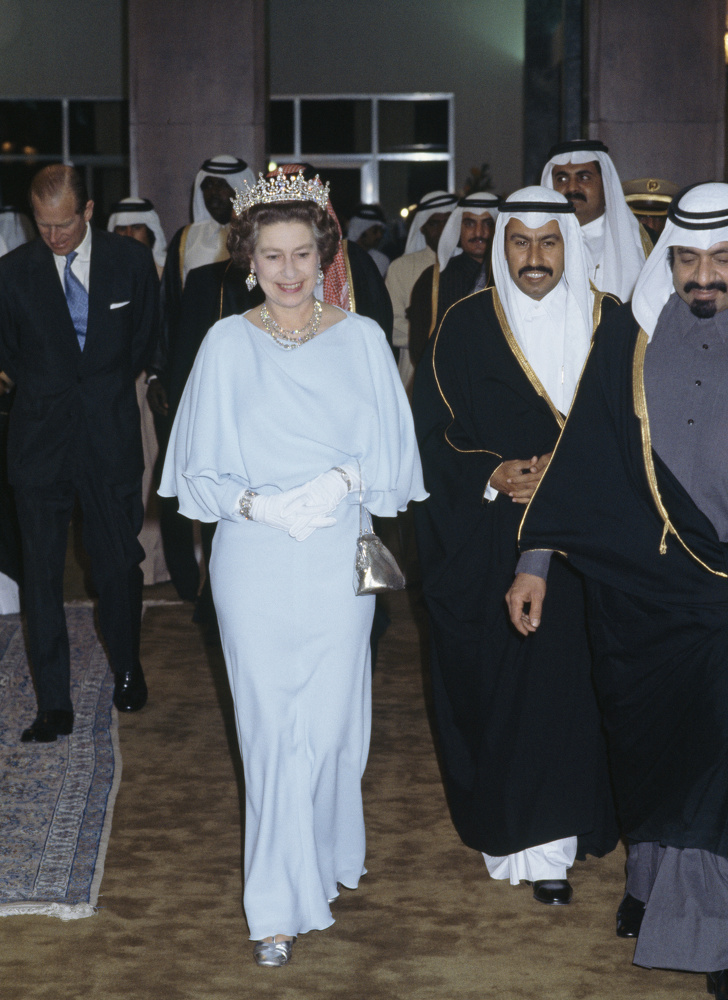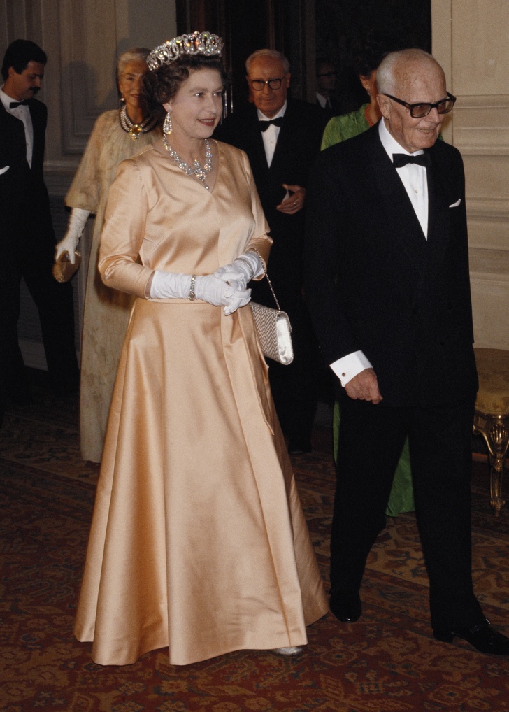 Єлизавета II прибуває на банкет на честь еміра Кувейту в готелі claridge's в Лондоні, 1995 рік