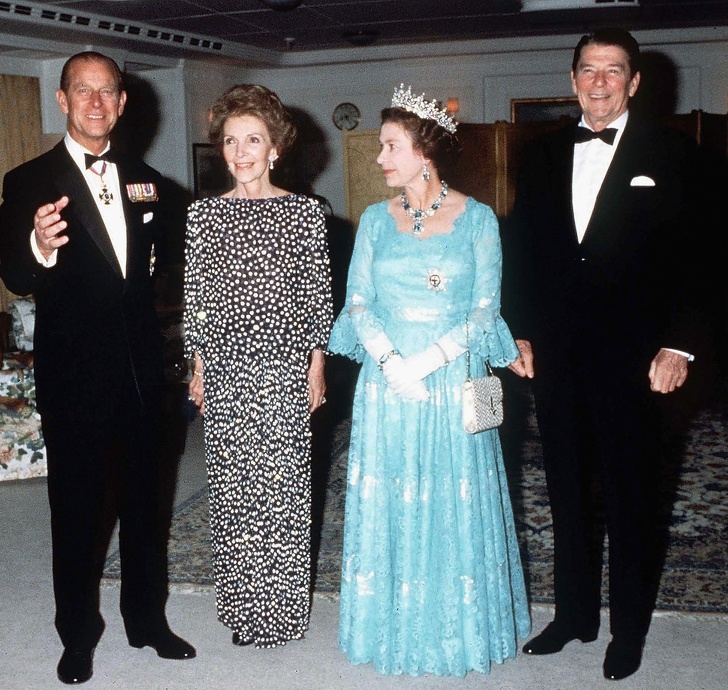 З принцом Філіпом, президентом США Рональдом Рейганом і його дружиною Ненсі Рейган. Банкет на борту Britannia, 1983 рік