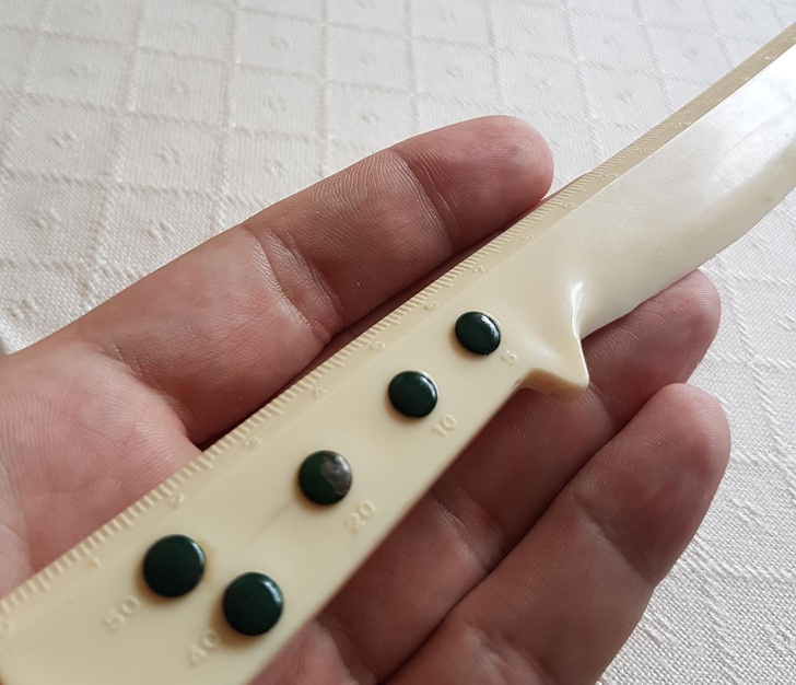 «Очевидно, що це ніж для листів з лінійкою. Але навіщо ці дивні зелені кнопочки?»