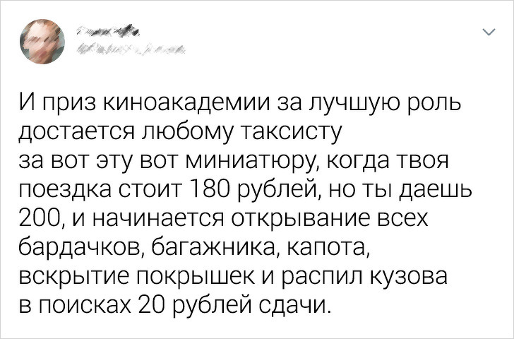 Історія друга-таксиста. До нього як-то раз сідає міцно напідпитку хлопець, нервовий, дивно себе веде. Навчений гірким досвідом, щоб не залишитися з носом, друг просить його внести аванс за поїздку в розмірі $ 20. Але у хлопця тільки $ 50 однією купюрою, він простягає її. Їдуть деякий час, і тут пасажир починає соватися, озирається, явно щось замишляє. На наступному світлофорі він відкриває двері і тікає, забувши про аванс і радіючи з того, який він хитрий, адже, на його думку, його довезли до місця безкоштовно. © ShozOvr / reddit