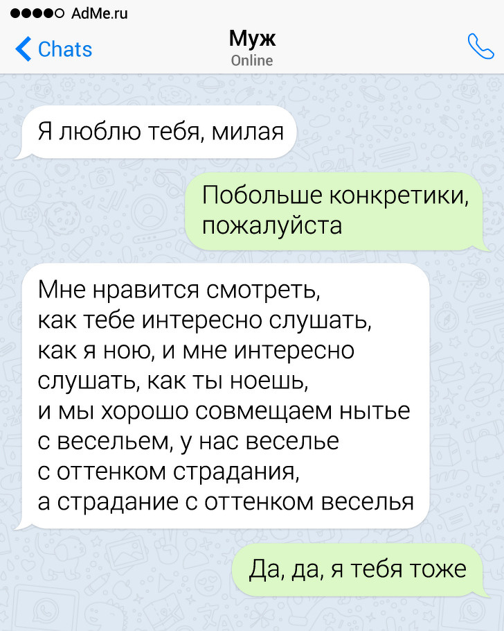 В кожній родині свої секрети міцних і щасливих відносин. Одні не обходяться без гумору, інші — без взаємних подколи, а треті використовують сарказм та іронію. Сьогоднішні СМС-листування — від людей, які щедро присмачують бесіди своєю дотепністю і красномовством.