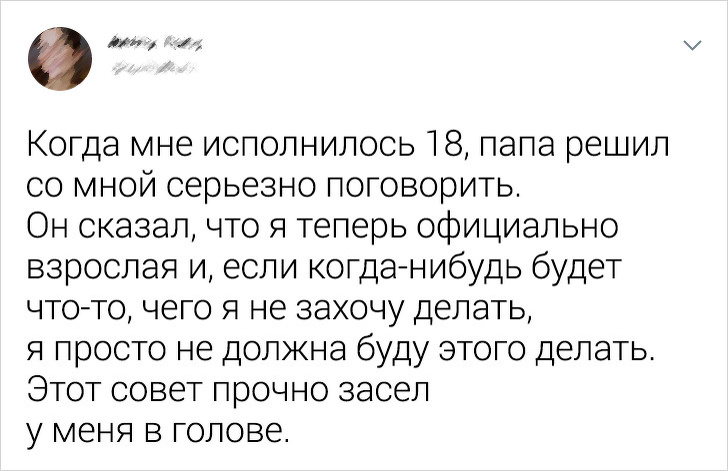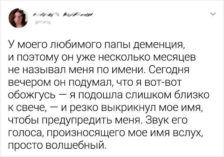 19. «Витратила 2 години на збори і перед виходом з дому застала тата, слухає музику і випиваючого в повній самоті. В цей момент я зрозуміла, що повинна зустріти Новий рік з ним»