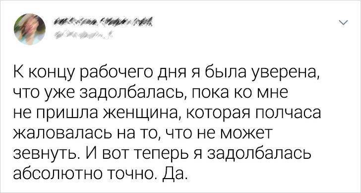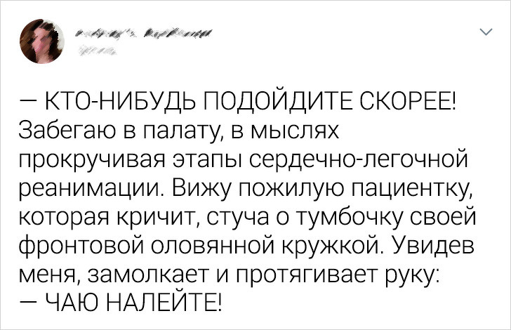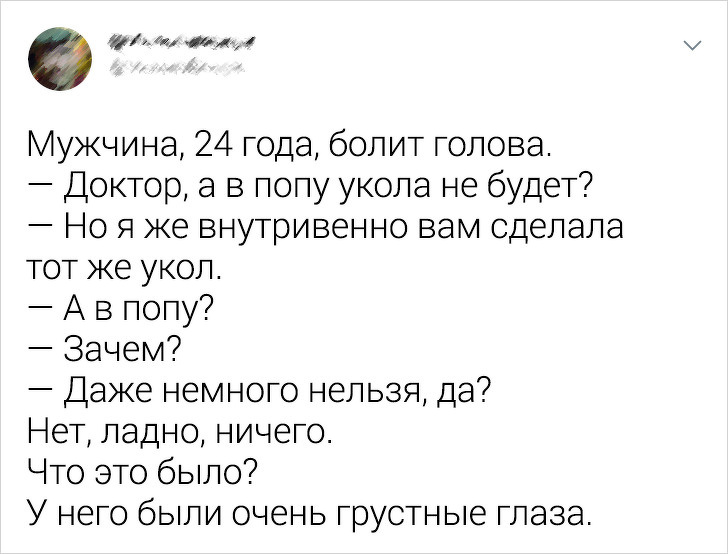 - Працюю в стоматології. Пацієнт заходить в кабінет хірурга, лягає на крісло, йому роблять анестезію. Пацієнт, лікар і асистент стоматолога сидять в тиші і чекають, коли почне діяти анестезія. Пацієнт закрив очі. І тут по кабінету летить муха. Лікар ляснув по мусі медичною картою, і та померла. Тиша. В цей час пацієнт все ще лежить на кріслі з заплющеними очима. Асистент, маючи на увазі муху, каже: «Здох, чи що?» Пацієнт відкриває повні страху очі. © Holodnik1 / pikabu