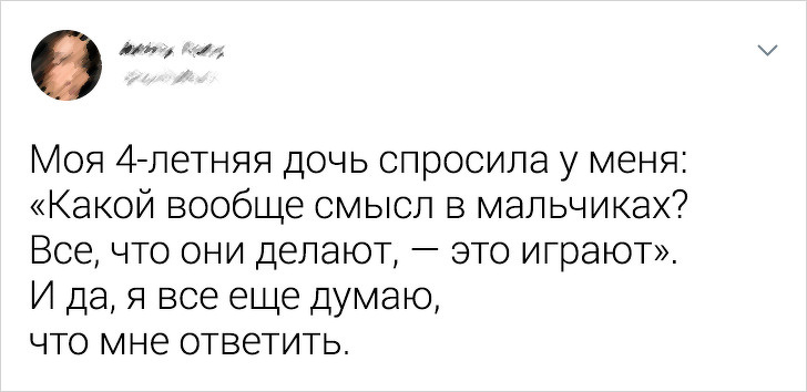 Минулої ночі мій 3-річний син штовхнув мене під час істерики. Коли я поклав його в ліжко, він вибачився. «Я більше не буду бити тебе, — сказав він, цілуючи мене в щоку. — Просто роби в точності те, що я тобі кажу, і мені більше ніколи не доведеться тебе штовхати». Здається, мій син — член мафії. © HenpeckedHal / Twitter