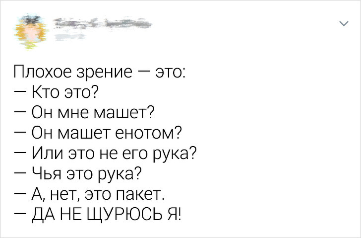 У мене поганий зір, і коли я намагаюся розгледіти йде мені назустріч людини, може скластися враження, що я його зневажаю... © VBerezovskiy / pikabu