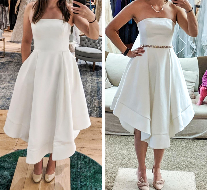 Весільне плаття до і після того, як його підігнали по фігурі і декорували поясом