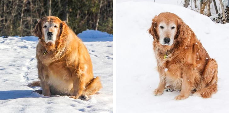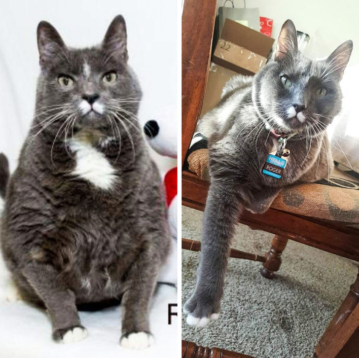 "Коли Роджера віддали на "усиновлення", він важив 9 кг. Через рік любові, дієти і належного ветеринарного догляду він скинув близько 2 кг. Роджер все ще великий хлопчик, але тепер він активний і щасливий".