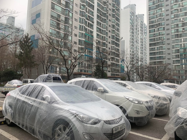 Житловий комплекс перефарбовують, і малярі накрили плівкою всі машини на стоянці, щоб захистити ті від бризок фарби