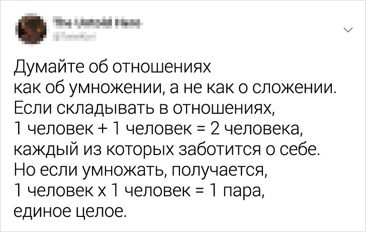 Мій батько похитав головою і сказав: «Не існує ніякого „порівну“. В один день доведеться пожертвувати заради партнера всім своїм часом і силами, але це неодмінно окупиться: в інший день партнер зробить те ж саме заради тебе. Якщо ти не цінуєш партнера настільки, щоб ставити його щастя вище твого, ти не заслуговуєш, щоб він робив це заради тебе».