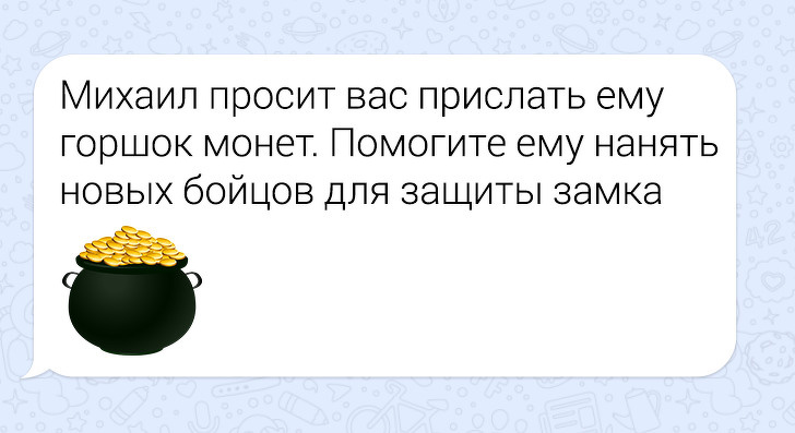 Строкаті листівки з примітивними малюнками з приводу і без популярні вже давно. Вони максимально знеособлені і не несуть ніякого смислового навантаження. Іноді шквал подібних картинок (особливо у свята) може привести до сказу навіть самих врівноважених. Що відповідати людині, яка не потрудився навіть написати повідомлення?