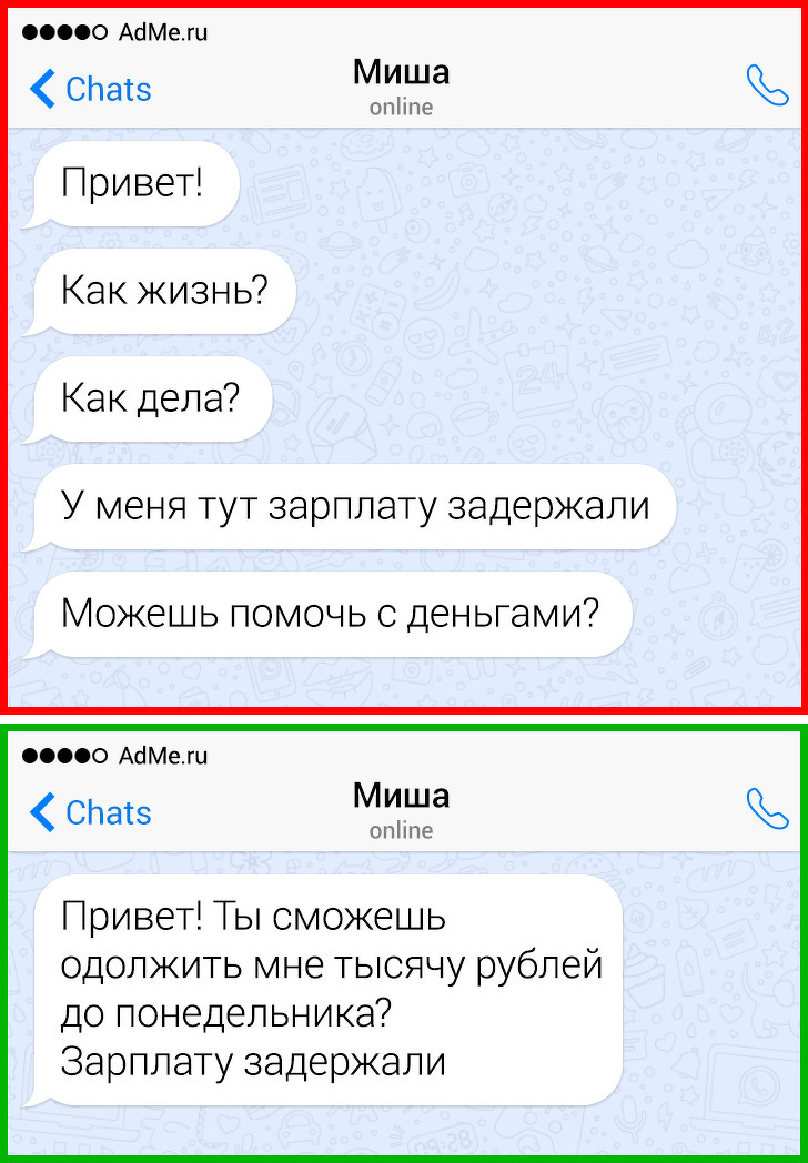 Постійні повідомлення на телефоні про кожному слові, яке набране окремим повідомленням, діють на нерви і відволікають. Особливо такий стиль недоречний в діловому листуванні. Якщо ви знаєте, що хочете написати, не полінуйтеся спочатку сформулювати у своїй голові думка, а потім викласти її в одному повідомленні.