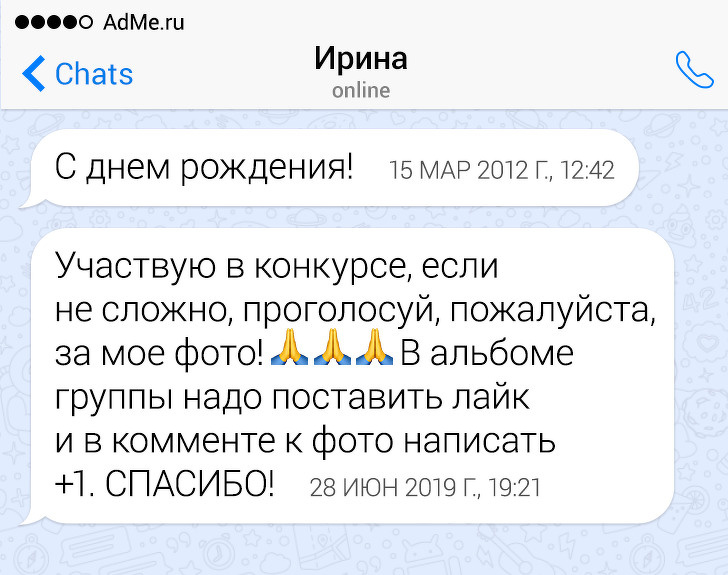 Серед безлічі «конкурсів лайків і репостов» дивно піддатися спокусі взяти участь хоча б в одному. Тільки так необхідно відправляти повідомлення з проханням проголосувати всім своїм друзям, особливо однокласника, з яким ви не спілкувалися 10 років? Це виглядає недоречно і може дуже дратувати. Подумайте, чи варто воно того.