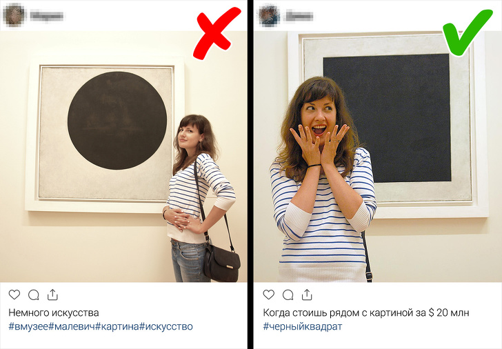 Фотографії людей, просто стоять поруч з відомими картинами, не викликають у оточуючих ніяких емоцій. Всі розуміють, що єдина мета — показати всім, що людина ходила в музей. Таке вихваляння формує враження про автора фото як про поверхневої і недалекій особистості.