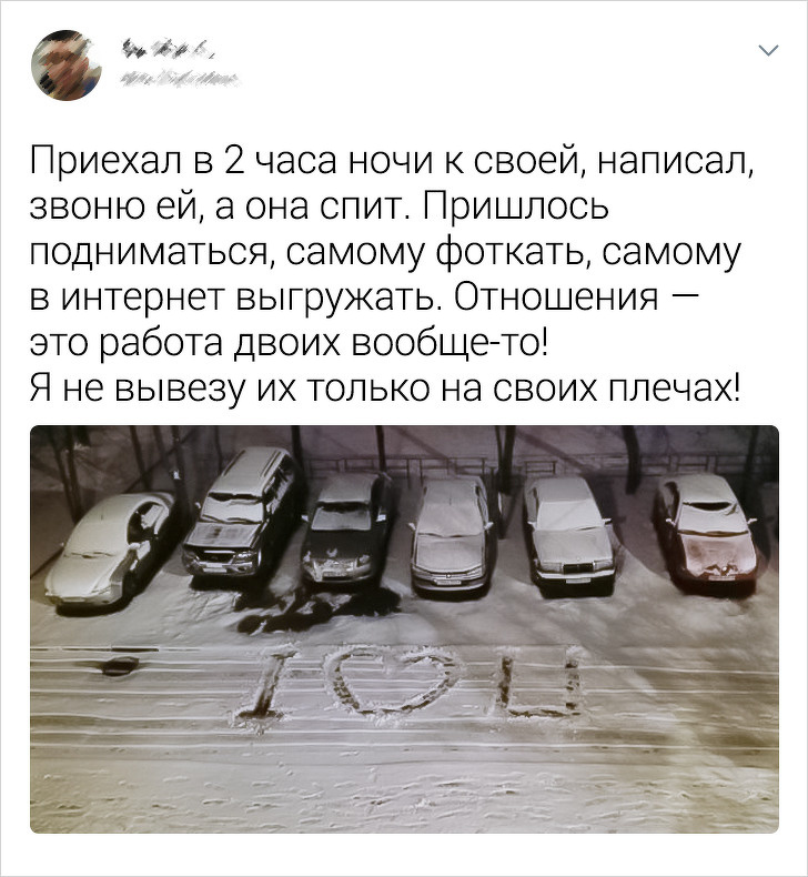 - Лежимо з чоловіком. Я йому розповідаю, як провела день в декреті: що слухала цікавий тренінг і вчуся більше любити себе, тому що останнім часом сильно себе запустила і весь вільний час витрачаю на дитину, готування і прибирання. Він мене наче уважно вислухав і відповідає: «Ще цю зиму на всесезонці поїжджу, а на наступний вже класну, шиповану куплю!» © Olivo4ka8 / pikabu